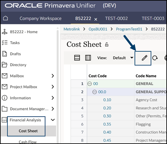 Within the Cost Sheet, click View > Create New View or use the pencil icon in the tool bar.