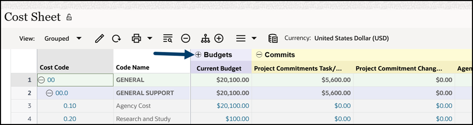 Finally, we love the Grouping feature for the Cost Sheet. This is where you can group “like” information such as all the budget or commit columns together.
